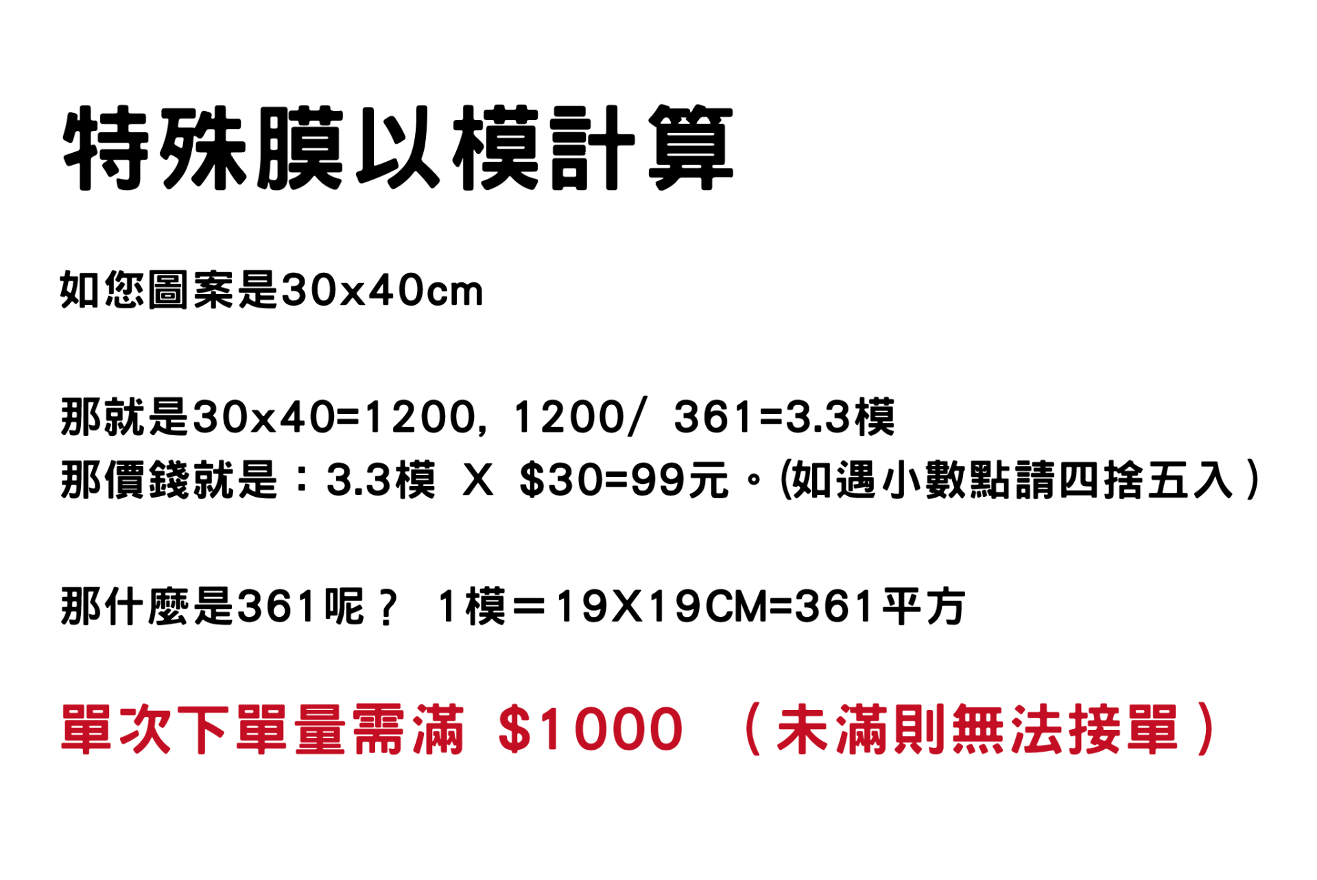 那價錢就是:3.3模 乘 $30=99元。(如遇小數點請四捨五入)