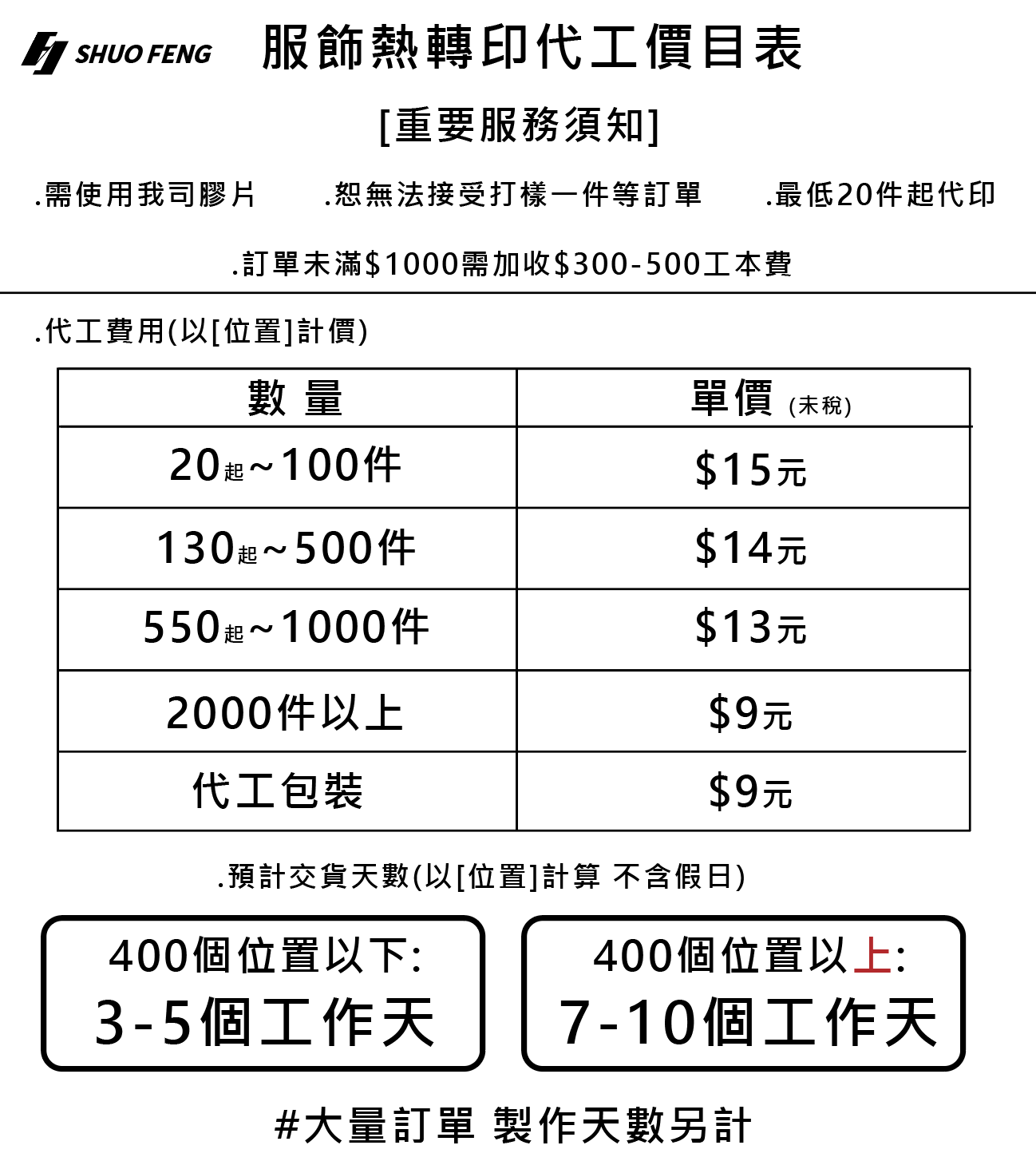 少量/特殊製作加價說明